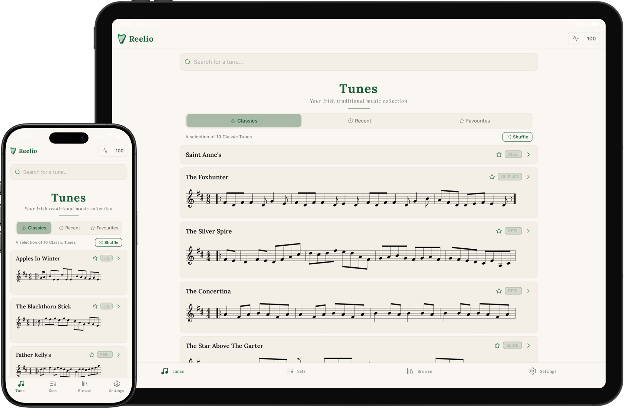 Find tunes, read sheet music optimised for phones and tablets, build sets, play along. Reelio puts Irish traditional music at your fingertips.